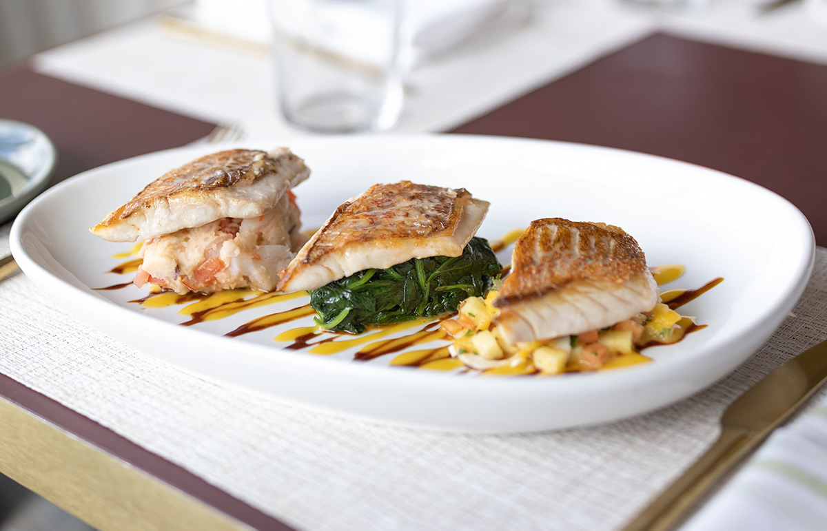 The House Burger ($18) was everything a burger should be: juicy, perfectly cooked, and served on a toasted bun. But Van Bomel also beefed it up (pun intended) with caramelized onions, gruyère, arugula and a savory truffle aioli. Living in Florida, those of us who enjoy fish have had snapper. So Van Bomel surprised me with his Florida Snapper Trio ($38). Small filets that are wonderfully seared are placed over three different preparations, including a tropical fruit mélange, ginger-garlic sautéed spinach and the creamiest lobster red potato mash. I’d go back for this.