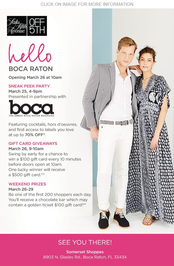 Mark your calendars: Saks Fifth Avenue OFF 5TH is opening up in the Somerset Shoppes in Boca Raton at the end of March. The store is hosting a preview party on March 25, beginning at 4 p.m., featuring a live DJ, light refreshments and a first look at the store. There will also be giveaways (see image below for more details) throughout the grand opening weekend.