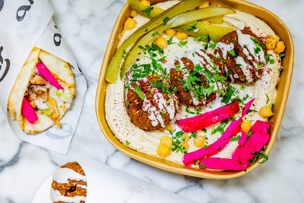 When we visited during a weekday at lunch, we sampled a good chunk of the menu, including its chicken shawarma wrap, beef shawarma bowl, salad, falafel and man’oushe (a Lebanese flatbread). The shawarma wrap was my first and favorite selection from the spread, with its wellseasoned chicken, crunchy pickles and za’atar fries wrapped in a fresh-baked pita (also available on a gluten-free wrap). The wrap’s garlic toom sauce won’t do your breath any favors, but its strong (and I mean strong) garlic flavor is really what made this dish a home run.