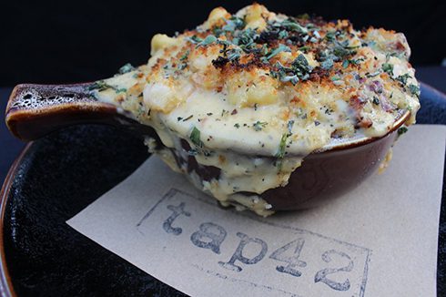The oven baked shrimp mac & cheese at Tap 42 is amazing! It’s full of shrimp, mushrooms, bacon and lots and lots of cheese, with a Parmesan herb crust. It’s a meal in itself, but the signature burger and fries are pretty tast,y too. And they have a huge selection of beer.”