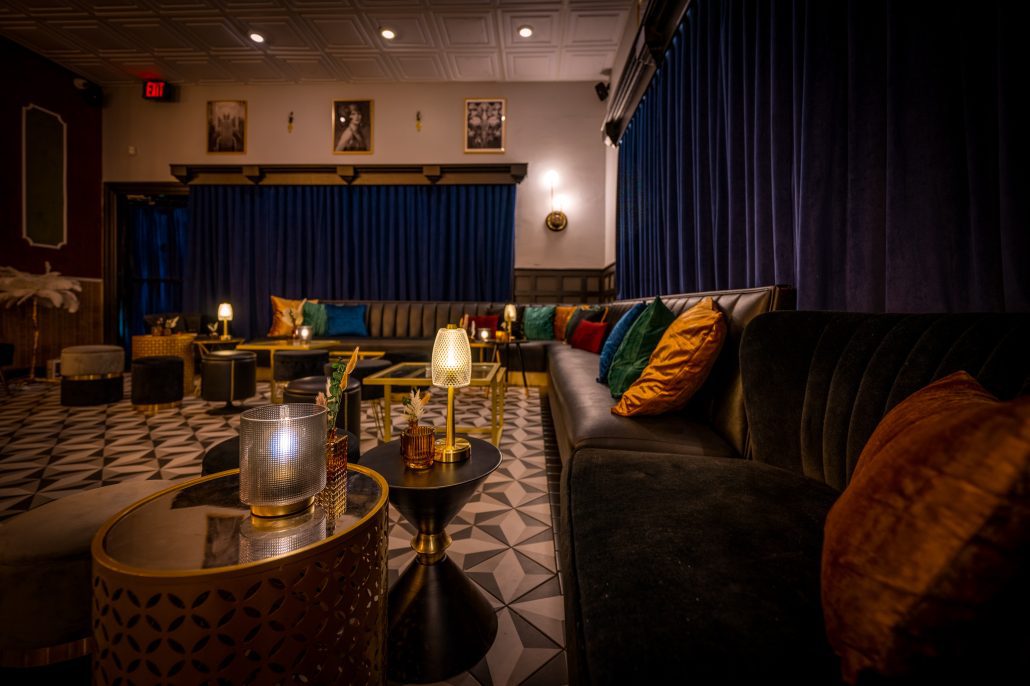 The color scheme is dark and sultry, a perfect place to escape. A full length mirror etched with the saying “A little party never killed nobody” invites guests to relax and let go of their worries. Wood paneling on the ceilings add warmth along with the richly textured dark navy curtains. To break up the darker tones, a beautiful shade of green is incorporated via the sushi bar’s seats, tiling and even lighting. Vintage images adorn the walls above to further tie in the 1920s, an ode to a bygone era that was very special in our local history. Boca Raton was officially incorporated, Addison Mizner came down from Palm Beach to make his architectural mark, and The Boca Raton was built, just to name a few of those historical highlights.