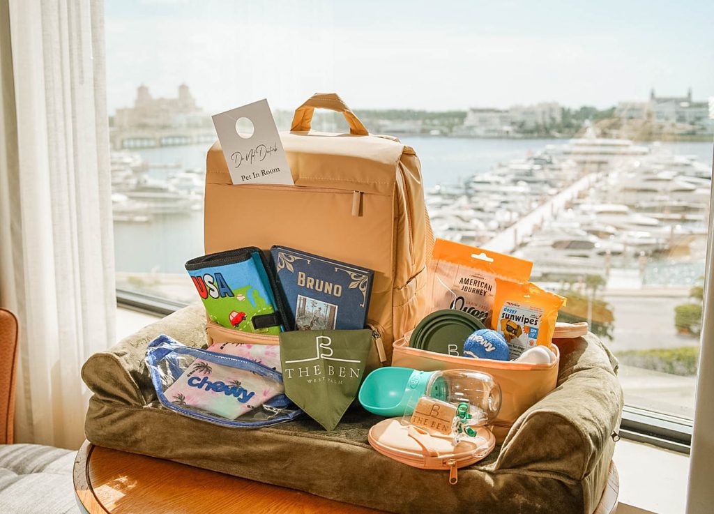 When we checked in, a staff member presented us with a khaki backpack filled with goodies from Chewy—a collapsible food and water bowl set, travel water bottle, a bag of treats, toys, tropical bandanna, sunblock wipes, an insulated bag, and contact information for a virtual vet appointment, should it be needed. It was easy to slip onto my suitcase handle and I can see us using the bag for future trips or when he’s dropped off with a pet sitter.