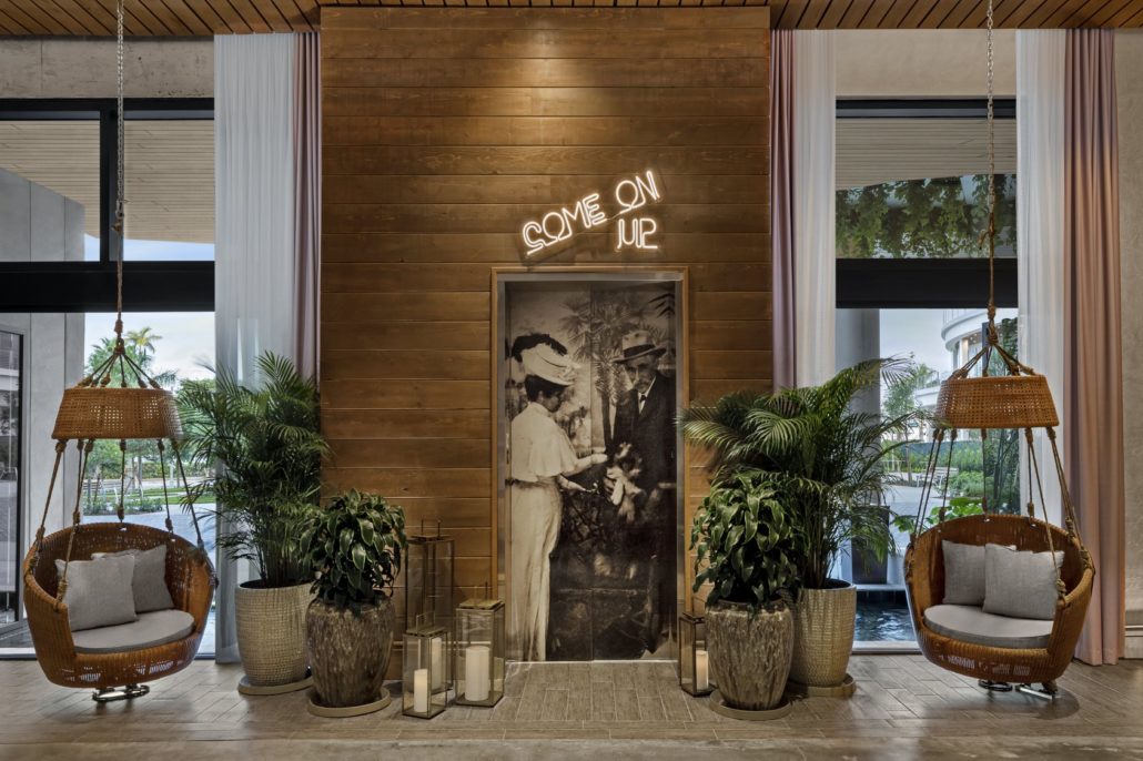The lobby was transformed to replicate the feel of walking into a South Florida estate with floor to ceiling bookshelves, chairs hanging 25 feet high, and unique character with furniture and accessories that deserve a second look.
