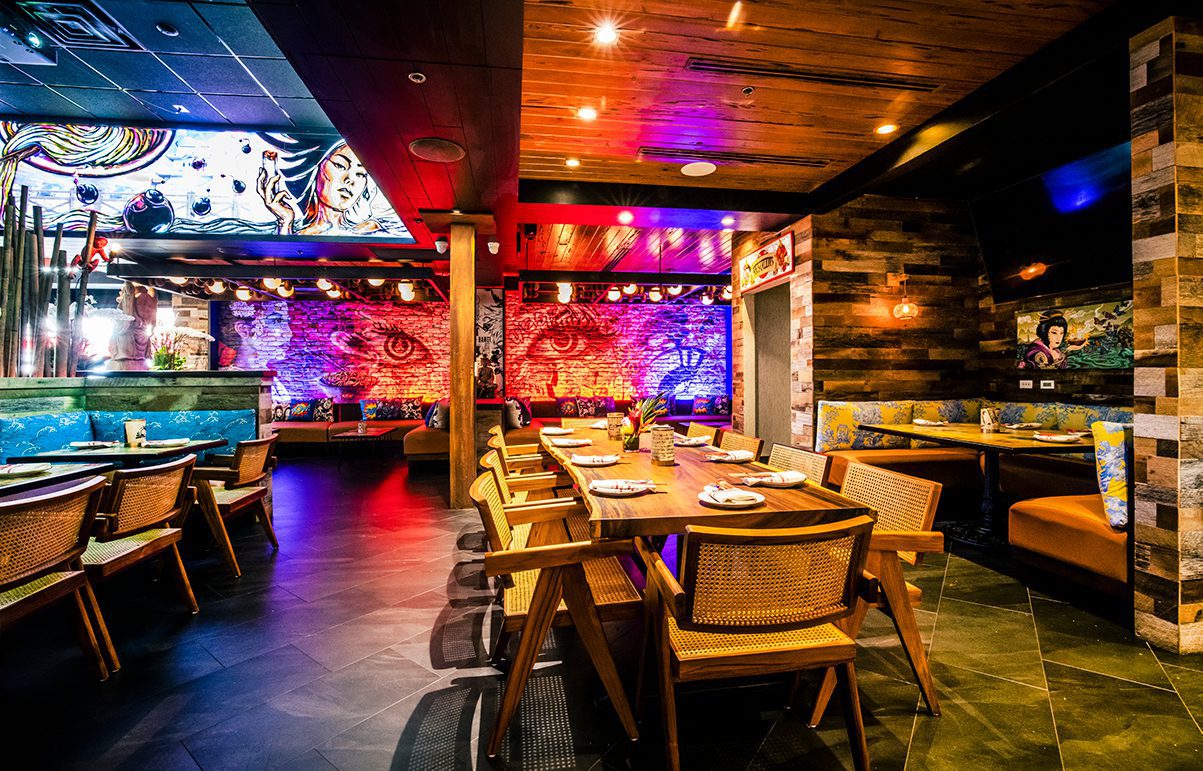Kapow Noodle Bar has been receiving culinary accolades since its debut in 2011, but the interiors of the new Mizner Park location deserve the spotlight too. As important as the food is at any restaurant, ambiance plays a significant part in the entire culinary experience and Kapow is the epitome of doing just that. It’s truly a visual feast, with one visit to Kapow not enough to take in all the intricate design details. Co-founders Vaughan Dugan and Rodney Mayo worked alongside the Manhas Design team and a group of Florida-based artists to bring their vision to life. “By enlisting the talent of top creatives, we are merging art, technology, and sustainability in a way that helps us lay the foundation for the future of the Kapow brand,” shares Dugan.