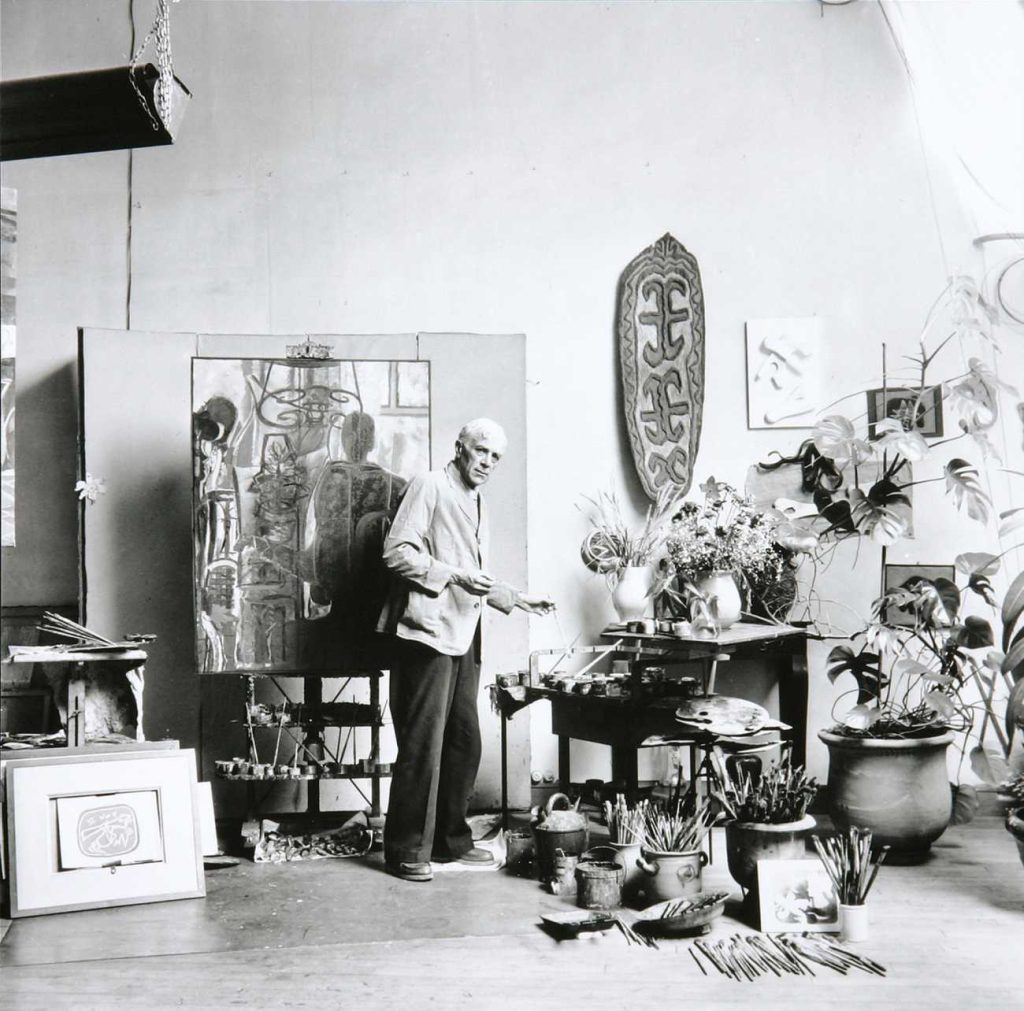 Photographers’ images of other working artists, by contrast, feel more accurate and less sentimental, if no less composed than the self-portraits. Their richness derives from their details as much as their framing: In a Robert Capa photo, Matisse, a cigarette adangle, contemplates a canvas, a studio wall filled with his drawings, the floor covered by newsprint. In Willy Maywald’s image of Georges Braque, brushes sprout from pots like flowers in bloom, the artist almost caught unawares under Maywald’s lens. While gazing at these works with heightened focus, it’s tempting to seek forensic evidence of how these talented men and women lived. What to make of the mussed blanket on a cot in Maywald’s photo of Fernand Leger? Did the artist sleep there occasionally?