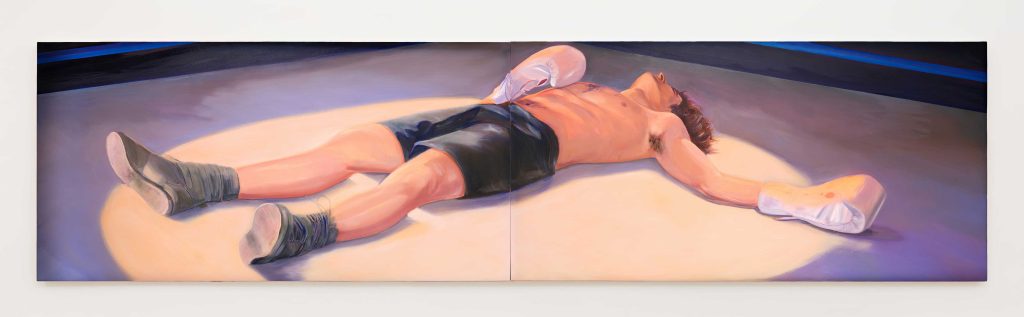 But some of the most memorable works in “Strike Fast” are from artists for whom I was unfamiliar—and that strip the sport of its braggadocio and machismo. The feeling of being on the losing end of a match is deeply felt in Caleb Hahne Quintana’s “How a Fall Can Make You Real,” which depicts a boxer flat on the mat, defeated under the harsh glare of a spotlight, in an eerie void where nothing else exists. Similarly, Fletcher Martin’s “Down for the Count” takes a more Cubist approach to its depiction of a fallen pugilist, who exists not in a traditional ring but a triangular liminal space.