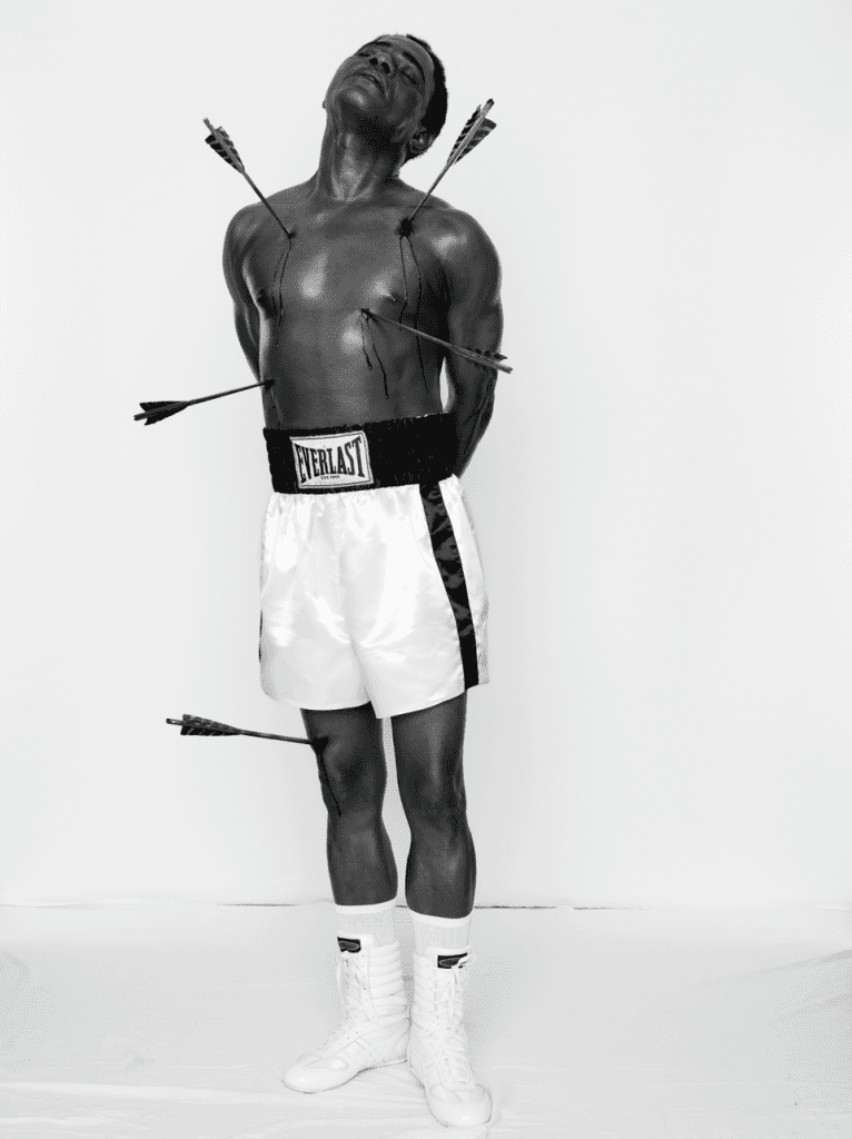 But the most powerful image in “Strike Fast, Dance Lightly,” to bring this alternately sacred and profane exhibition full circle, seems to show Ali, although it’s really the artist himself dressed in the boxer’s familiar apparel. In Samuel Fosso’s staged photography “Self-Portrait (Muhammad Ali),” part of a broader series, Fosso presents Ali as a martyr—the planet’s greatest athlete standing but slain by the literal slings and arrows of society, as a result of his outspoken politics.