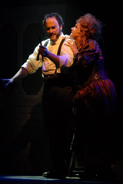 Other times, the actors themselves are the problem, as when they can’t keep up with Manny Schvartzman’s musical direction; on opening night, it often appeared they were rushing through the numbers to get through them on time. Karen Chandler channels the correct kooky spirit for Mrs. Lovett, but she could have used a (better?) dialogue coach, because her British accent is inconsistent. King’s performance as Judge Turpin is all affect and no conviction, failing to instill any of the scorn and creepiness his character is supposed to engender; when he limply strokes his back with a whip in the self-flagellation scene, it comes off as comic, not disturbed. Vandepas and Antolino have lovely voices, and they sing well together, but as actors, they’re ciphers going through the motions. I haven’t even mentioned Ann Marie Olson, as the Beggar Woman; her amateur mistake at the end of the play undercut a tragic plot twist and resulted in derisive giggles from the audience; afterwards, probably frazzled, she missed a cue.