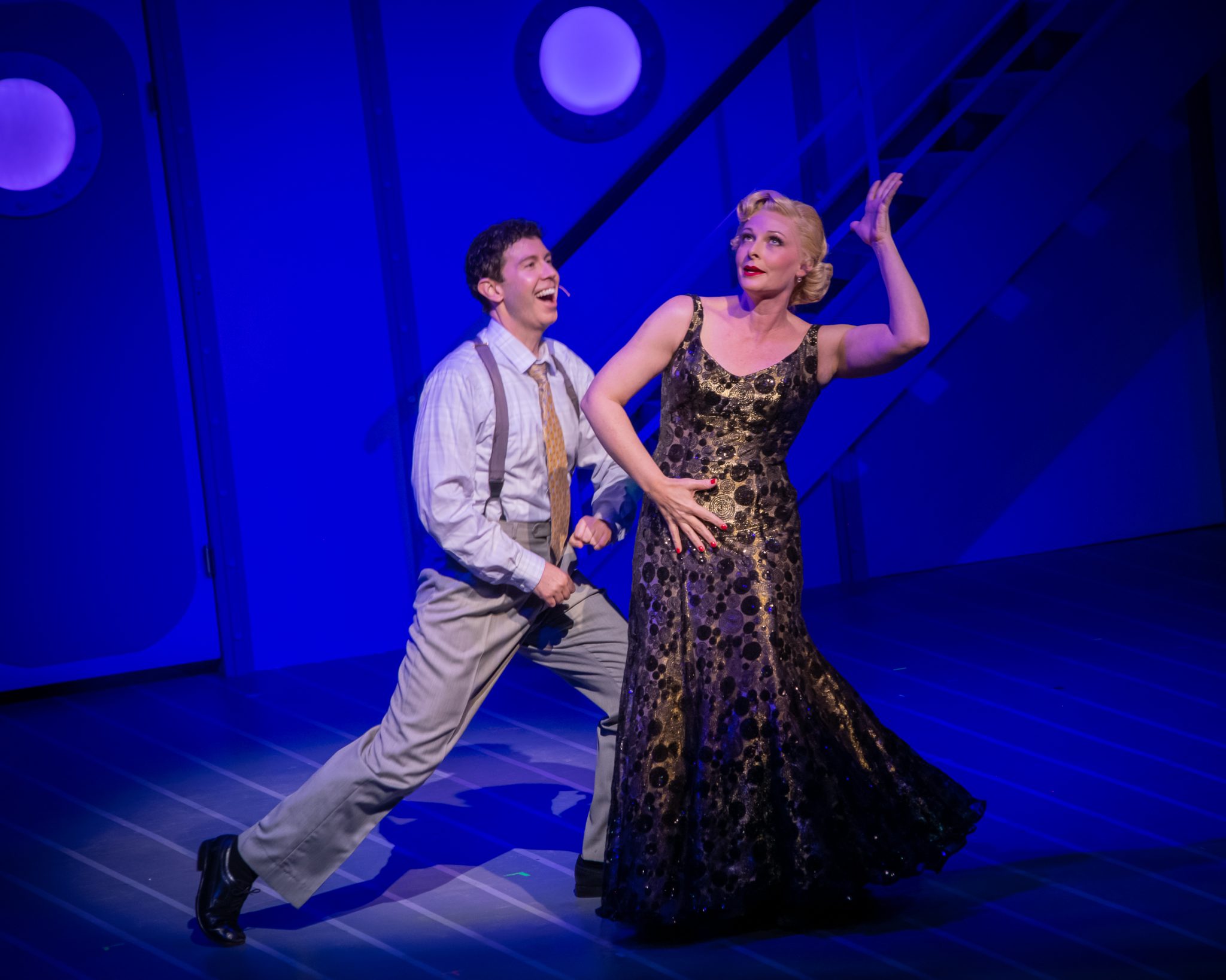 “Anything Goes” is set on a luxury cruise liner, the SS American, a traditional double-decker set designed with beauty and functionality by Ardean Landhuis. The vessel is bound for London, and it will be an eventful one for the clutch of passengers whose romantic and criminal pursuits we follow. There’s Billy Crocker (Jeremy Benton), a stockbroker who stows away on the ship to woo his beloved, the delicate debutante Hope Harcourt (Alexandra Van Hasselt). Hope, for her part, is set to marry a foppish English noble, Evelyn Oakleigh (Paul Louis), an arrangement that neither actually wants. Nightclub singer Reno Sweeney (Aaron Bower), meanwhile, is lovesick for Billy, though he only enjoys her company as a friend.