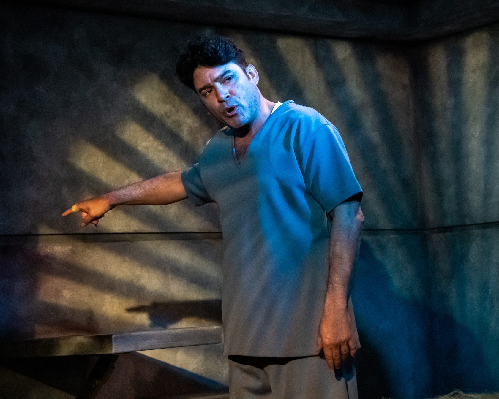 Ardean Landhuis’ scenic design offers plausible visions for the confines of both characters; the prison cell, in particular, has the illusion of unbreakable concrete, and is rich with telling details, like the soil stain on the pillow of Gabriel’s cot. Sound designer David Hart’s copious audio drops contribute stark punctuation—as in the form of harrowing gunshots—as well as the hazy echoes of each characters’ more carefree moments in life, which arrive and dissipate like the half-remembered daydreams they are.
