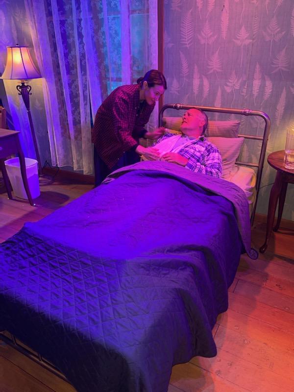 As Paul Sheldon, Gordon inhabits perhaps the play’s most thankless role. Bedridden or wheelchair-bound for 99 percent of the play, he builds character mostly through facial expressions and vocal delivery, and it’s a well-calibrated performance. He paints a picture of Paul as someone who uses deadpan humor as a defense mechanism to survive this most, indeed, miserable time of his life. When he hobbles out of a bad, groaning and wincing—and aided by a gruesome and accurate makeup job on his purple, swollen, bloody legs—we believe every painful movement.