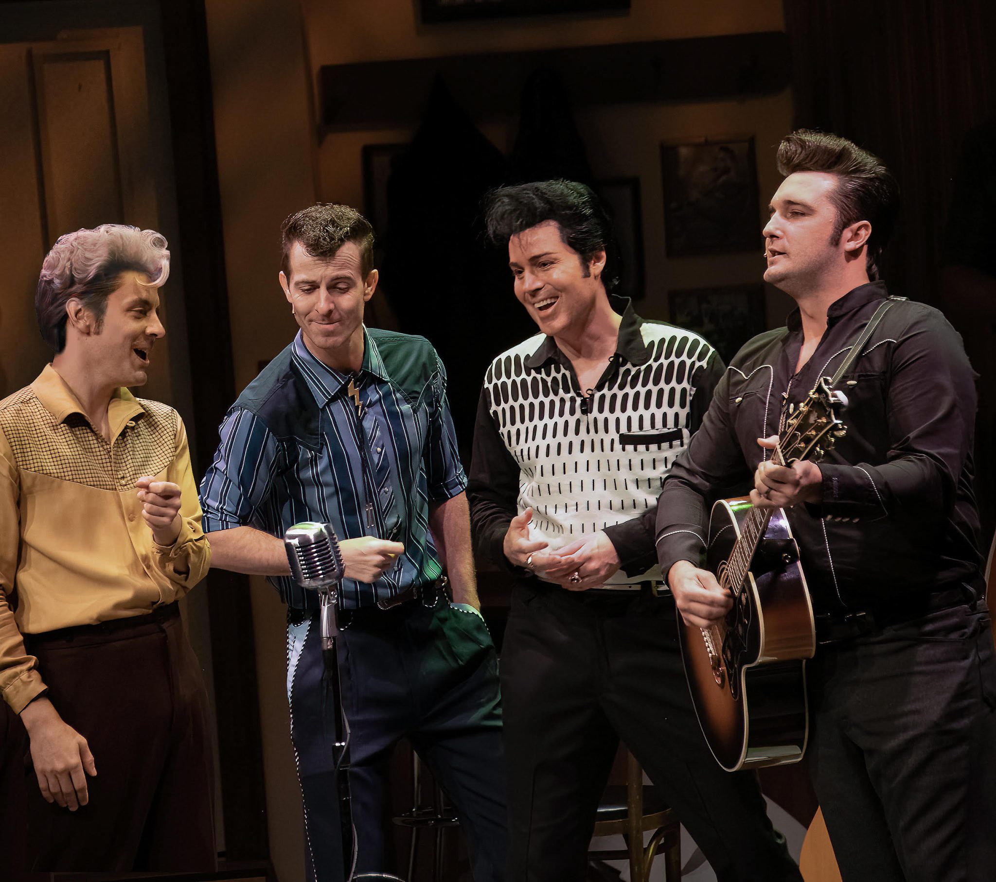 The actors—all of them, as mentioned, seasoned hands at their parts—communicate their roles without mimicry and caricature while still embodying their characters’ signature moves and cadences. Cole’s hips shake and legs wobble with Presleyan charisma. Lipinsky is a force of nature in the role, his fingers possessed as they dance across the 88 keys—when he’s not playing with his feet or his derriere, that is. McClure is a stoic presence as Perkins, and comes closest onstage to the definition of a musician’s musician: His guitar mastery is unmatched.