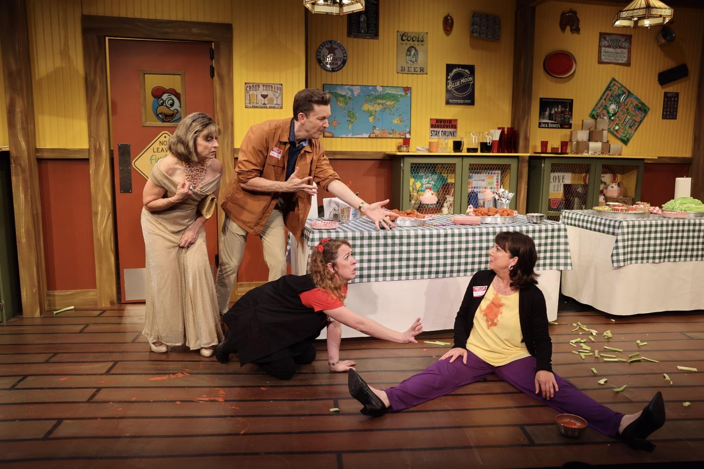 It’s all rather sitcommy, starting with Kaplan’s script, which unlike Landhuis’ set does not seem to exist in a recognizable reality. Every element onstage is an accident waiting to happen, characterizations are exaggerated, and a general sense of outsized daffiness is the show’s uneven tenor. One only needs to reflect back to a successful screwball comedy at Island City, “The Mystery of Irma Vep,” to notice how often “Tracy Jones” misses its marks. Its farcical moments of action, in particular—spilled drinks, doors slamming on faces, the inevitable Heimlich maneuver—fail to land.
