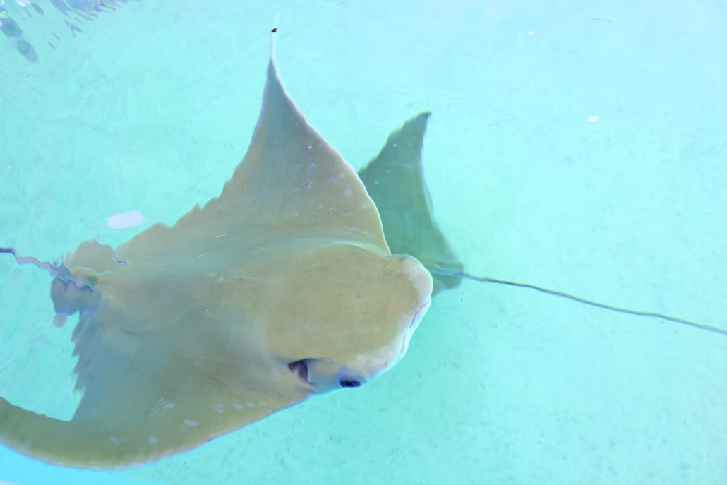 By 1 p.m., a small crowd has gathered for this near-daily ritual. Alyssa Dorfman, Sandoway’s director of education, feeds the rays first, their wavy forms descending on the shrimp in a frenzy, the swiftest swimmers capturing most of the spoils. It’s the same with the reef fish in the adjoining pool, but, belying its pop-culture reputation, Norma Jean turns out to be the gentlest of noshers.