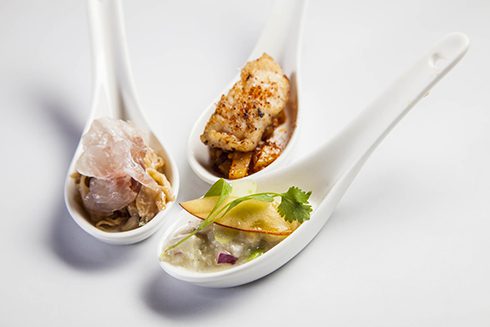 Chef Blake Malatesta from 50 Ocean emerged from semi-final #3 at Saltwater Brewery. His winning spoonfuls (pictured) consisted of several renditions of snapper dishes, including Himalayan salt-cured snapper with a cabbage dill remoulade (served with Spiny Tail English ale), harissa-marinated snapper with spiced German potato salad (served with Screamin’ Reels IPA) and snapper ceviche with avocado yuzu and nectarine (served with guava pineapple IPA).
