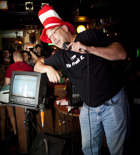 – We’re not trying to be the star. There are way too many people that became karaoke hosts because they wanted more stage time for themselves. In a perfect night, the Frank-E-Oke host will sing the first song, and never again. I fired somebody once for singing the last three songs of the night.