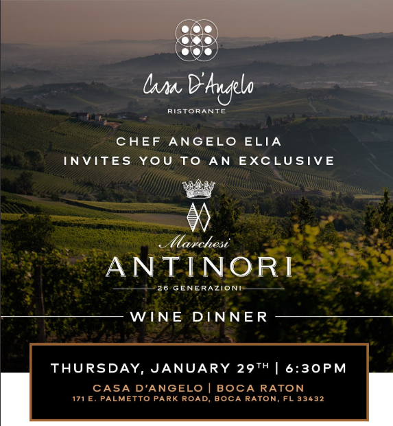 Casa D’Angelo Boca Raton will host an exclusive Antinori Wine Dinner on Thursday, January 29, 2026.