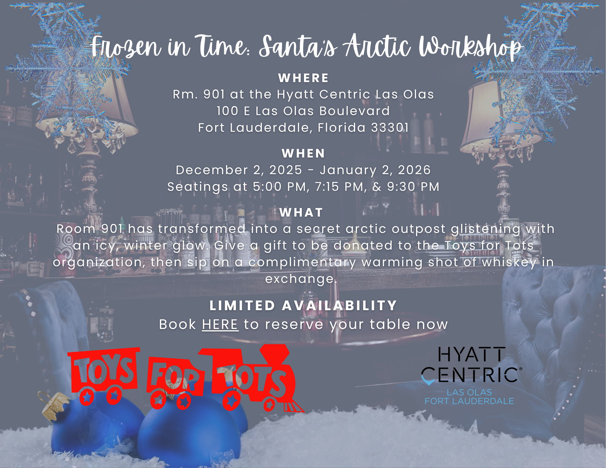 Room 901 has transformed into a secret arctic outpost glistening with an icy winter glow. Give a gift to be donated to the Toys for Tots organization, then sip on a complimentary warming shot of whiskey in exchange.
