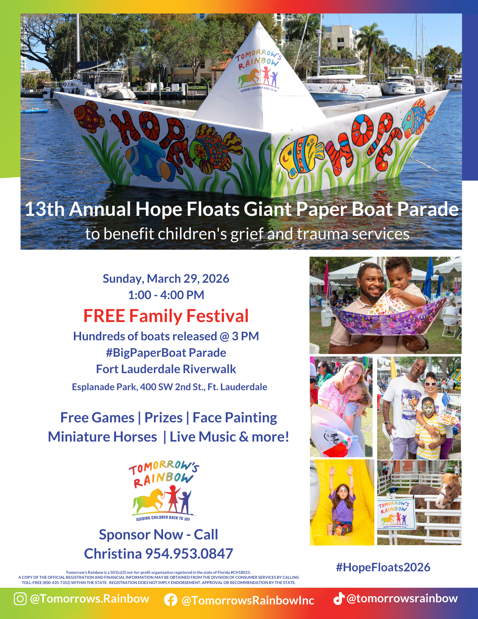 Hope Floats Benefiting Tomorrow’s Rainbow is a heartfelt, free family festival open to participants of all ages, created to celebrate the lives of those who are no longer with us but remain in our hearts forever. Everyone is invited to attend and encouraged to decorate paper boats in honor of their loved ones. The proceeds from Hope Floats support children, families, and individuals in our community who are healing from grief and trauma with the help of Tomorrow’s Rainbow services.