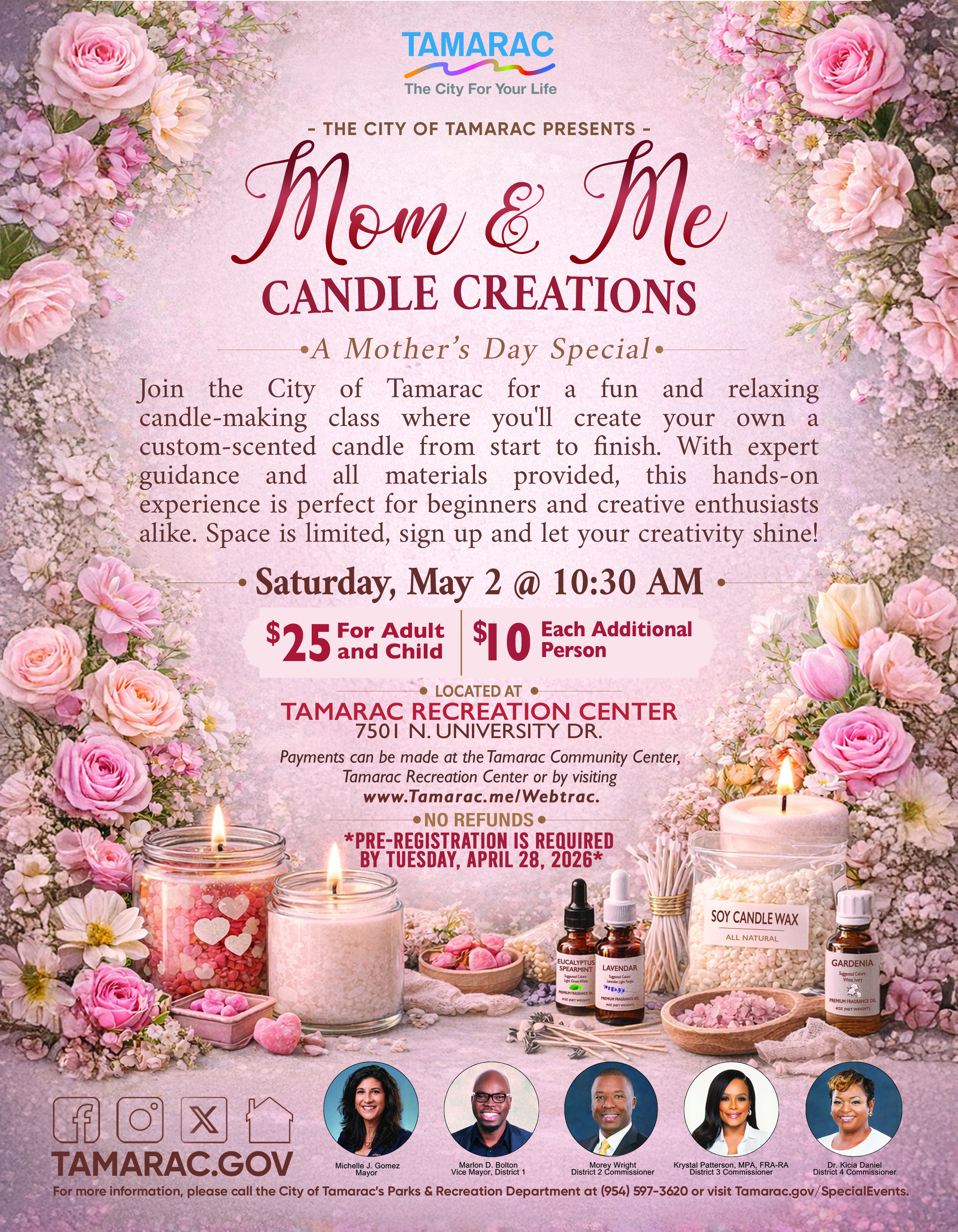 Join the City of Tamarac for a fun and relaxing candle-making class where you’ll create your own custom-scented candle from start to finish. With expert guidance and all materials provided, this hands-on experience is perfect for beginners and creative enthusiasts alike. Space is limited, sign up and let your creativity shine! Visit Tamarac.me/Webtrac to register; space is limited. Registration closes on Tuesday, April 28 or when capacity is reached. Price: $25 For Adult and Child | $10 Each Additional Child