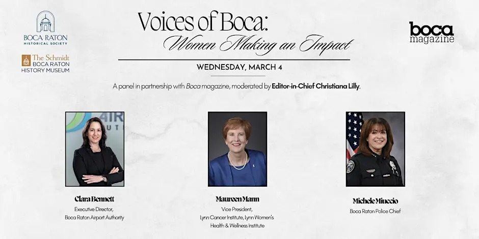 The Boca Raton Historical Society is celebrating Women’s History Month by shining a spotlight on three of the city’s top female leaders. This panel discussion, subtitled “Women Making an Impact,” features top local voices in health care, law enforcement and transportation: Maureen Mann, vice president of the Lynn Cancer Institute and Lynn Women’s Health & Wellness Institute; Michele Miuccio, Boca Raton Police Chief; and Clara Bennett, executive director of the Boca Raton Airport Authority. Boca magazine’s editor-in-chief, Christiana Lilly, will moderate the discussion, which will explore the speakers’ philosophies on leadership and their histories of delivering positive change and impact in their favorite city. The discussion will then open to an audience Q&A.