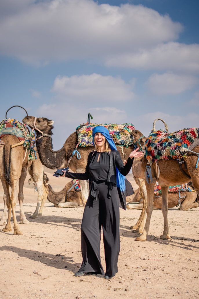 One of my favorites was the day Maryam took us out of the city and into the foothills of the Atlas Mountains, just miles from the edge of the Sahara, to have a “nomadic experience” and ride a camel. The night before our excursion, we were reminded by Maryam’s husband, Chris, that a camel’s knees are double-jointed, so we should wait for two lurches—the first one, forward; the second one, upright. Which I kept in mind as our guides emerged, in long Marjorelle blue tunics and sun hats. They had identical blue-and-black scarves for each of us, which they wound into very glamorous turbans inspired by the Berber nomads.