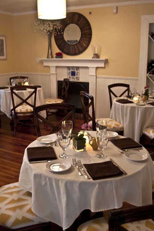 The restaurant itself has been handsomely restored and is as cute as the proverbial button, with hardwood floors, sunny yellow interior with white beadboard wainscoting, a columned fireplace and bistro-esque furnishings. There’s also a pretty outdoor deck set with tables shielded by canvas umbrellas. Sounds like just the place for a quiet, relaxed evening.